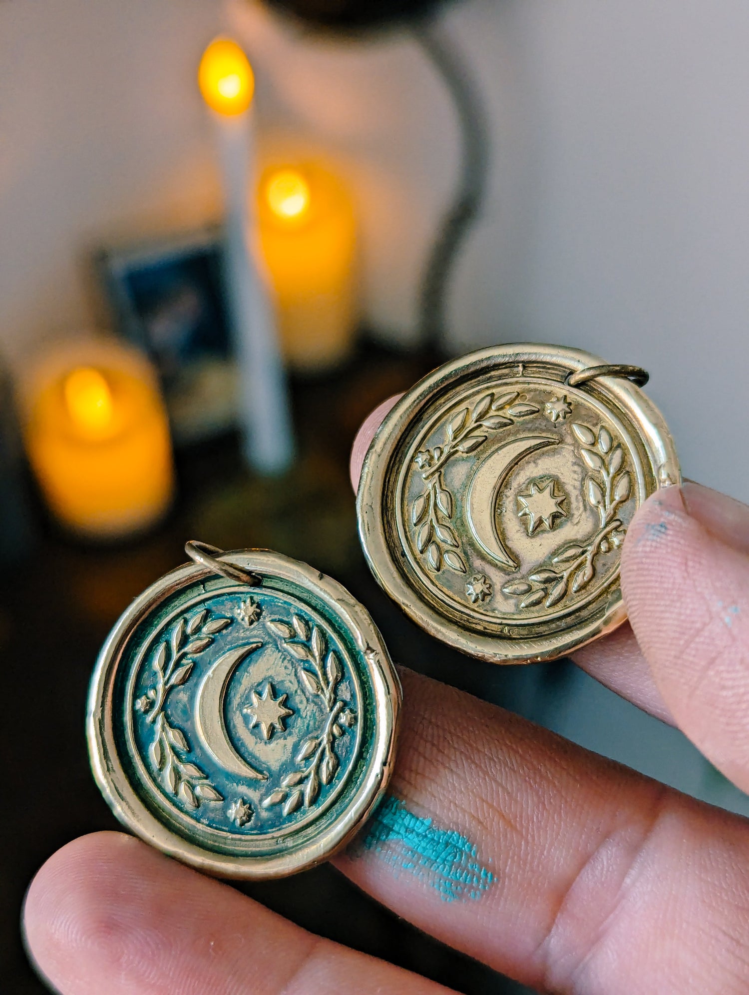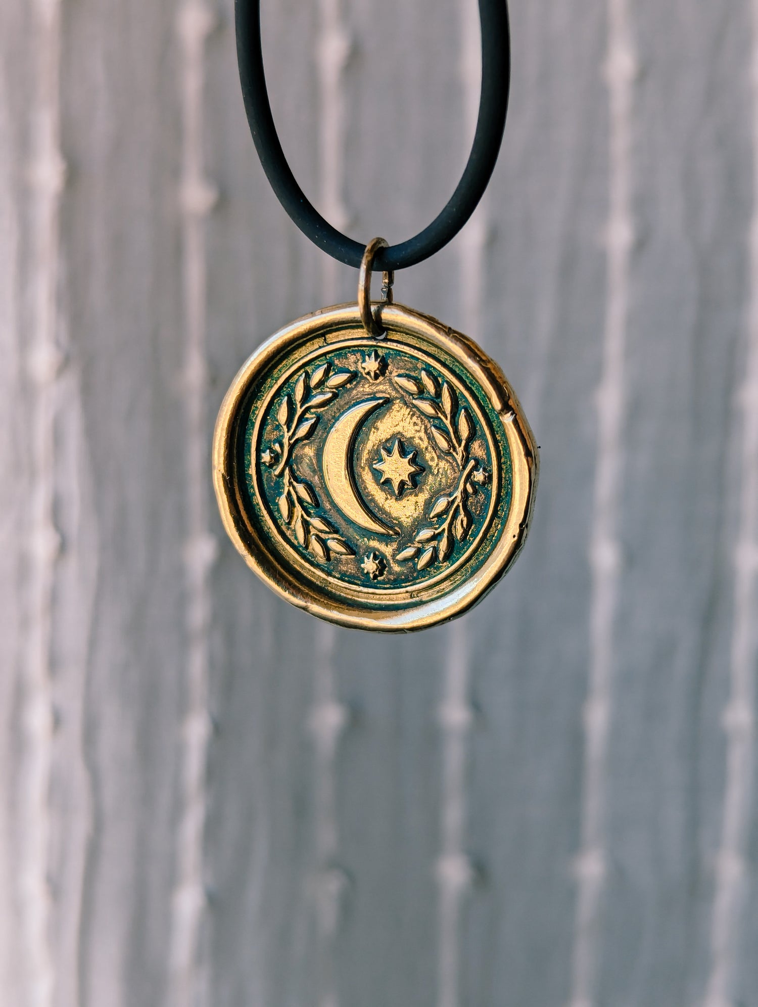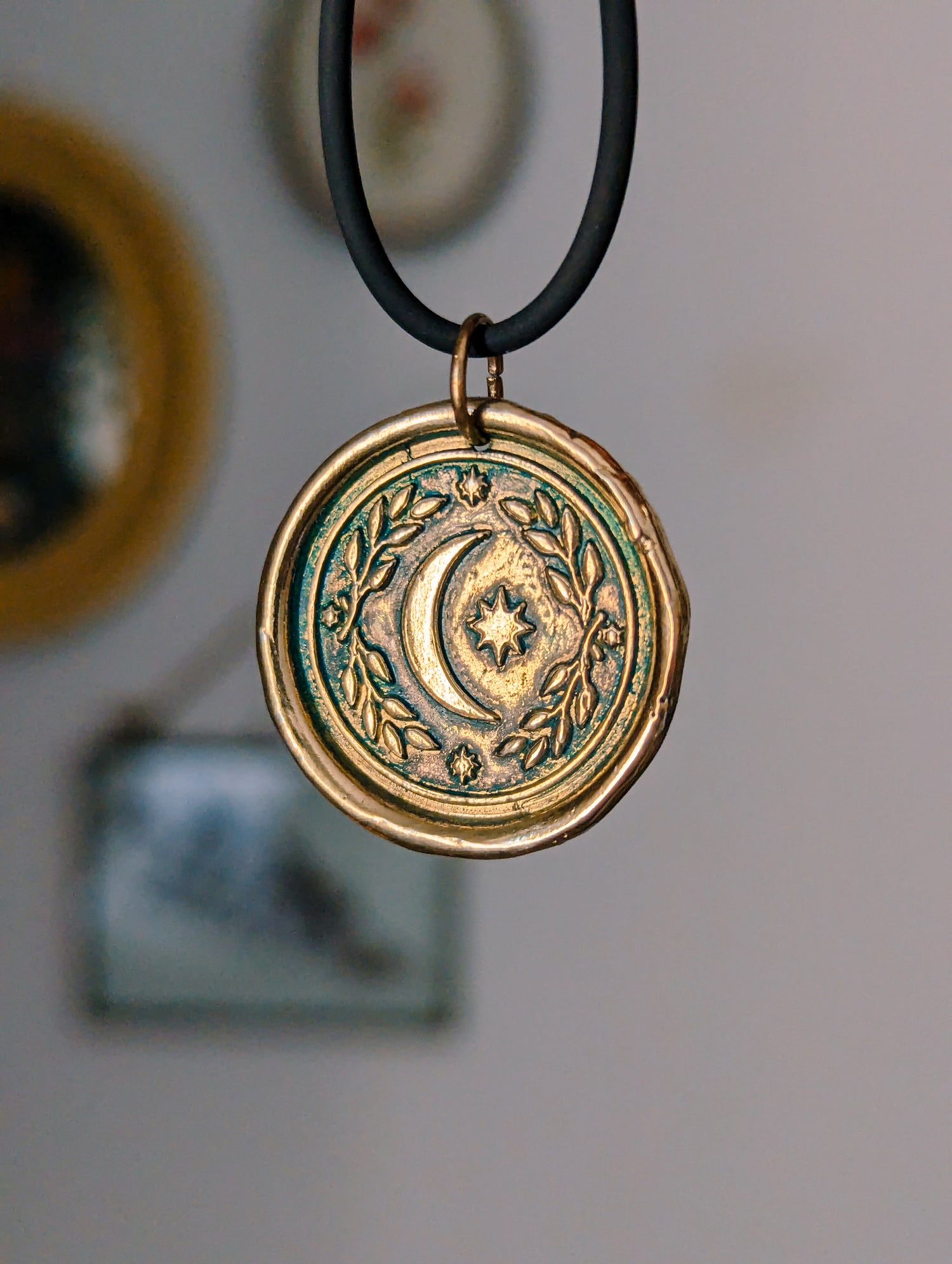 BRASS MOON MEDAL WITH BLUEGREEN PATINA - GOLDEN PENDANT WITCH TALISMAN by MEDUSA DOLLMAKER