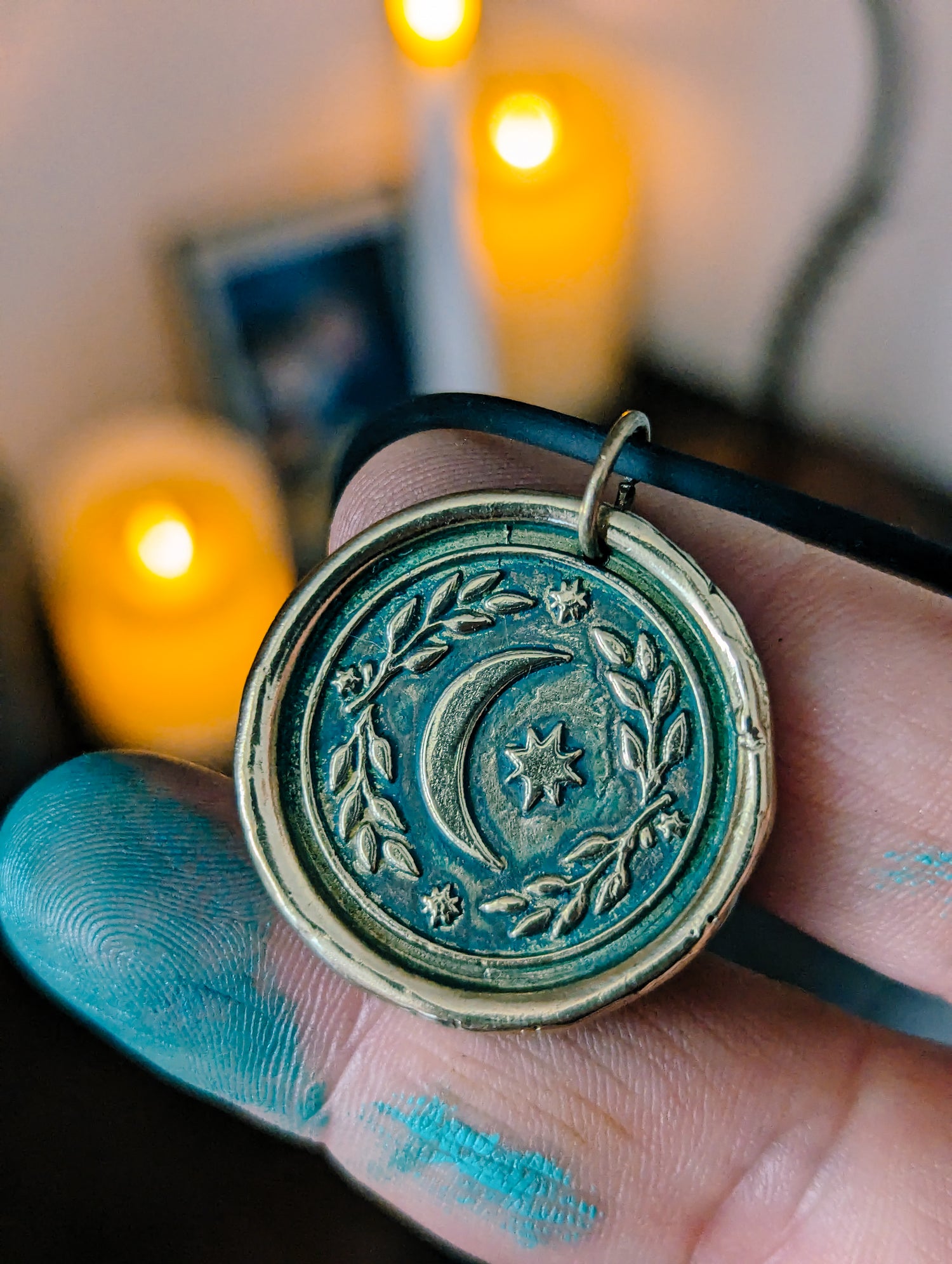 ★ Moon and stars medal pendant in BRASS metal WITH bluegreen patina. We painted some lovely bluish patina on this pendant just for you! Every finish its different and may look different from pictures (the blue patina may fade with time and gain some natural dark patina)