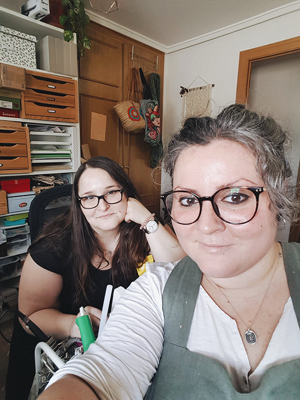 Miriam (the brunette lady) always felt a strong urge for books, writing and crafts. Dreamy, curious, passionate and creative, she's always up with new ideas and willing to help. She's my best friend and I trust her, so she takes good care of your orders and the admin stuff!