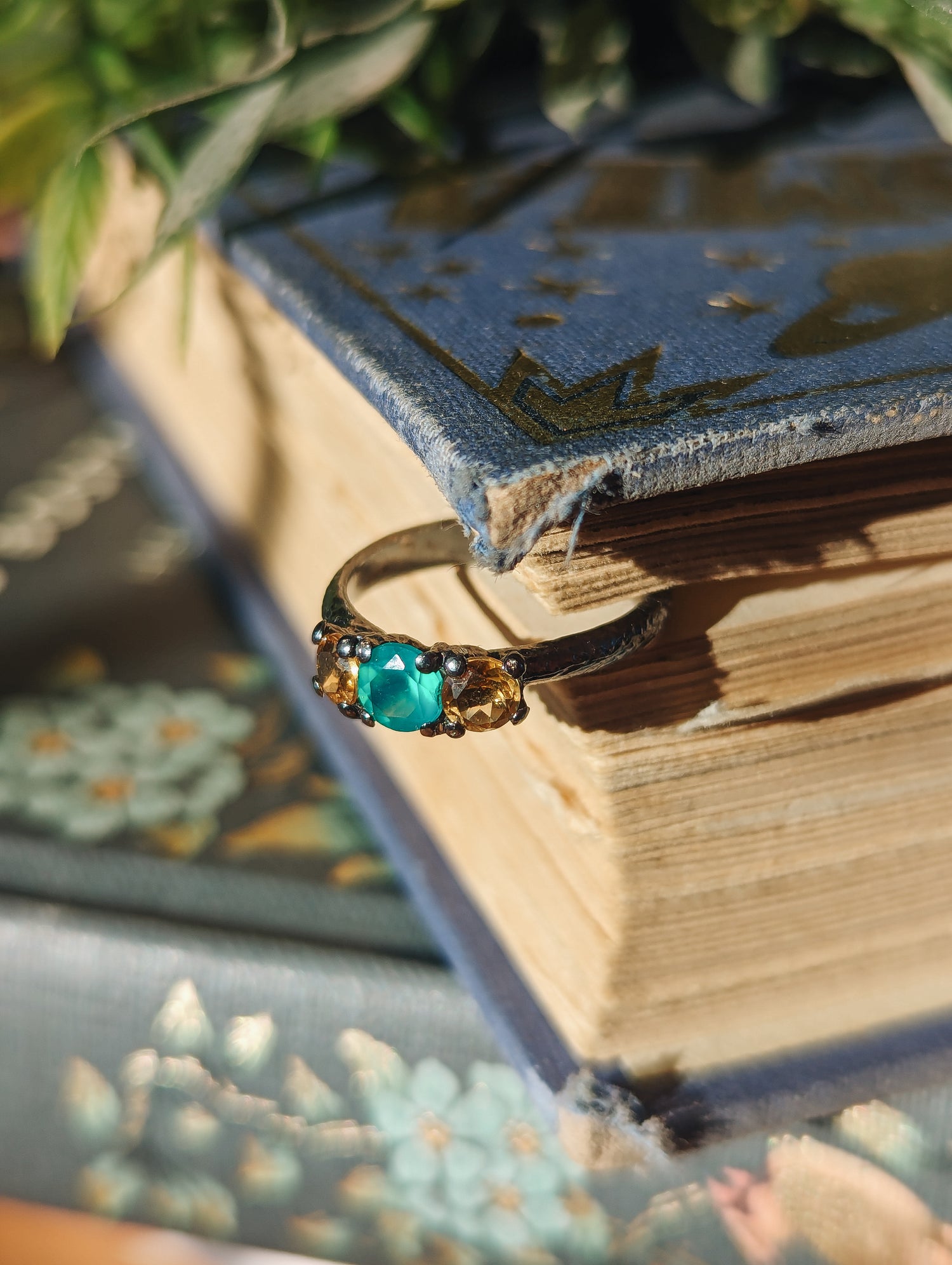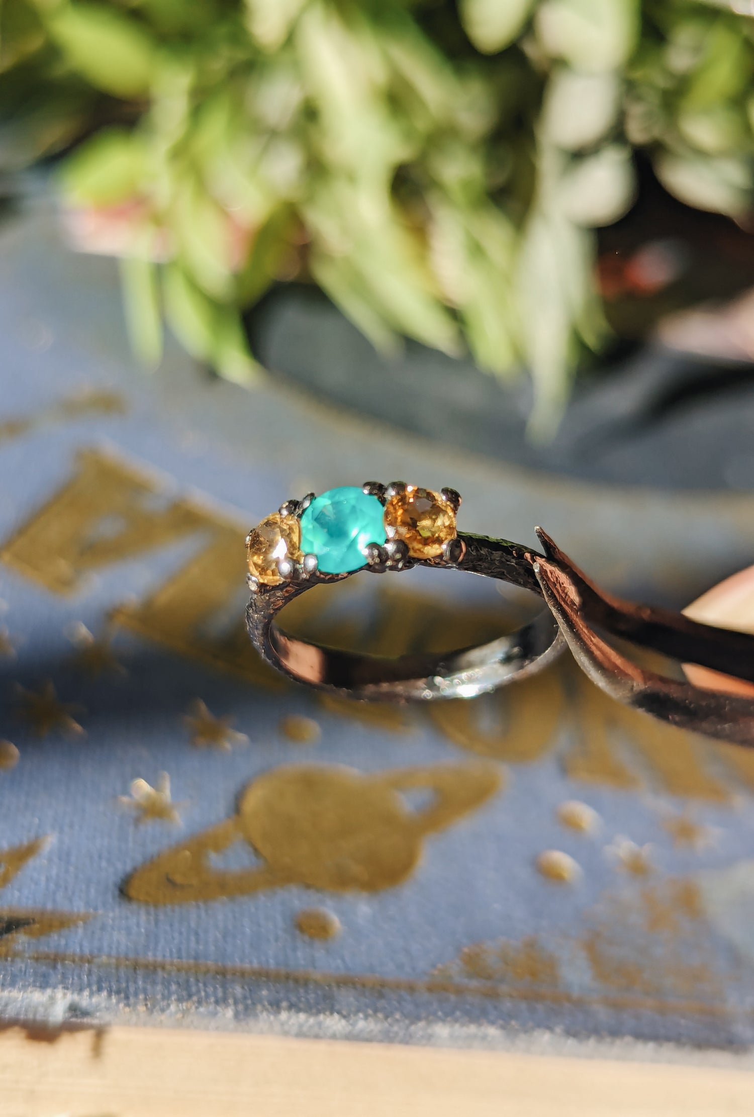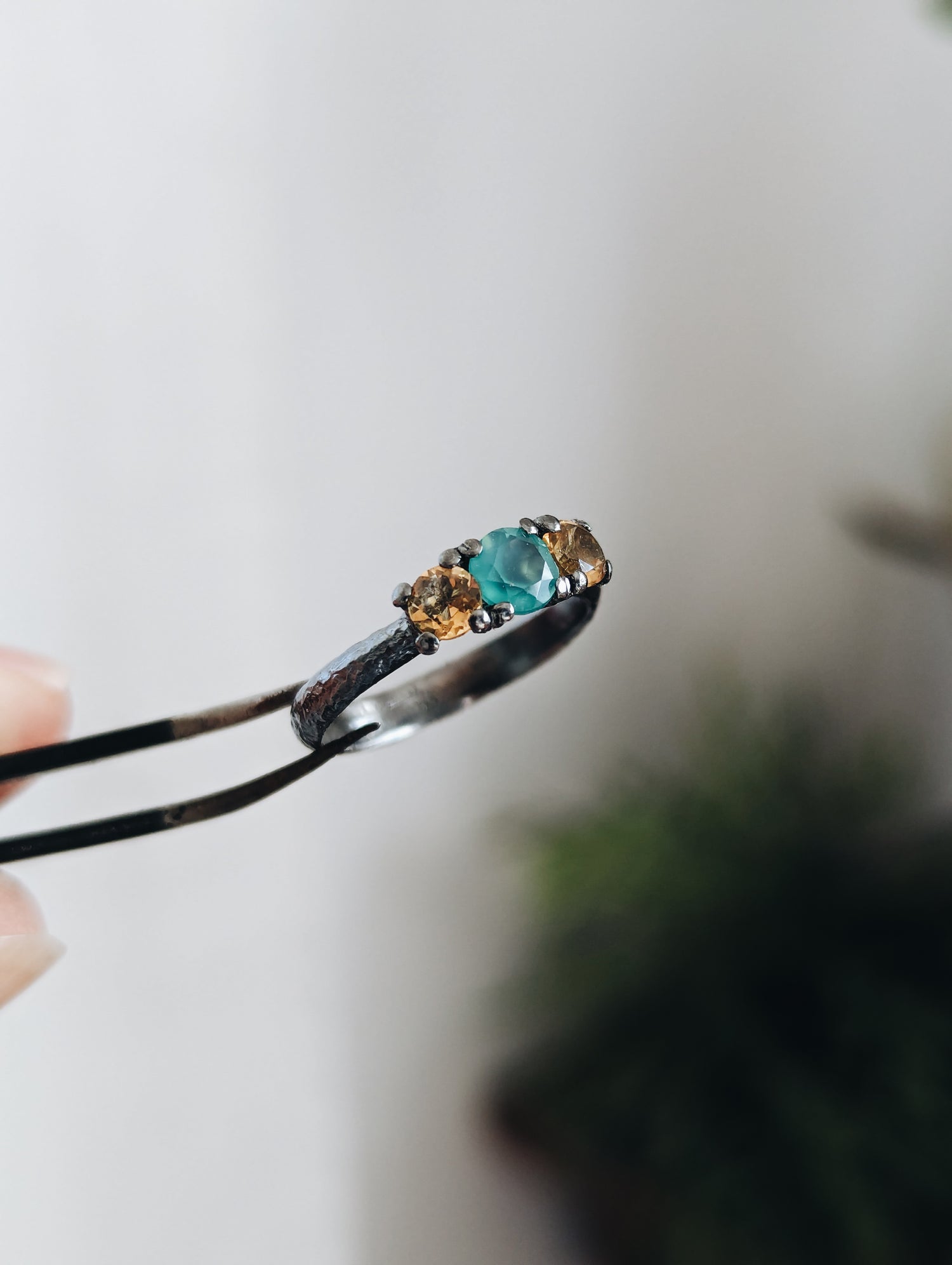 ★ BEAUTIFUL 925 Sterling silver texturized ring with a rustic, soft feel. Simple and minimalist. It has two delicate faceted citrine gemstones and a gorgeus chrisophrase. Made by Calero Design in Spain.