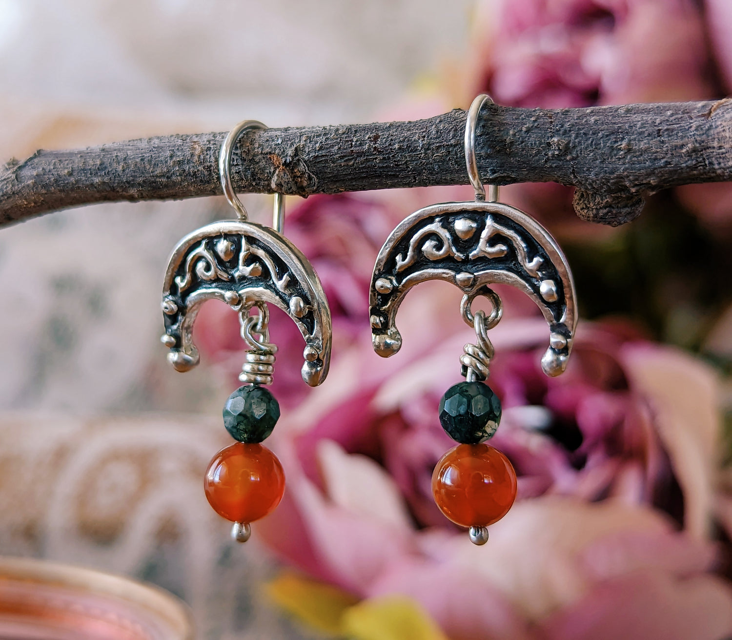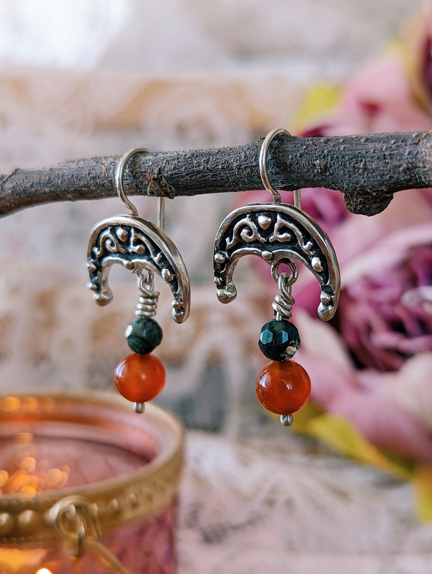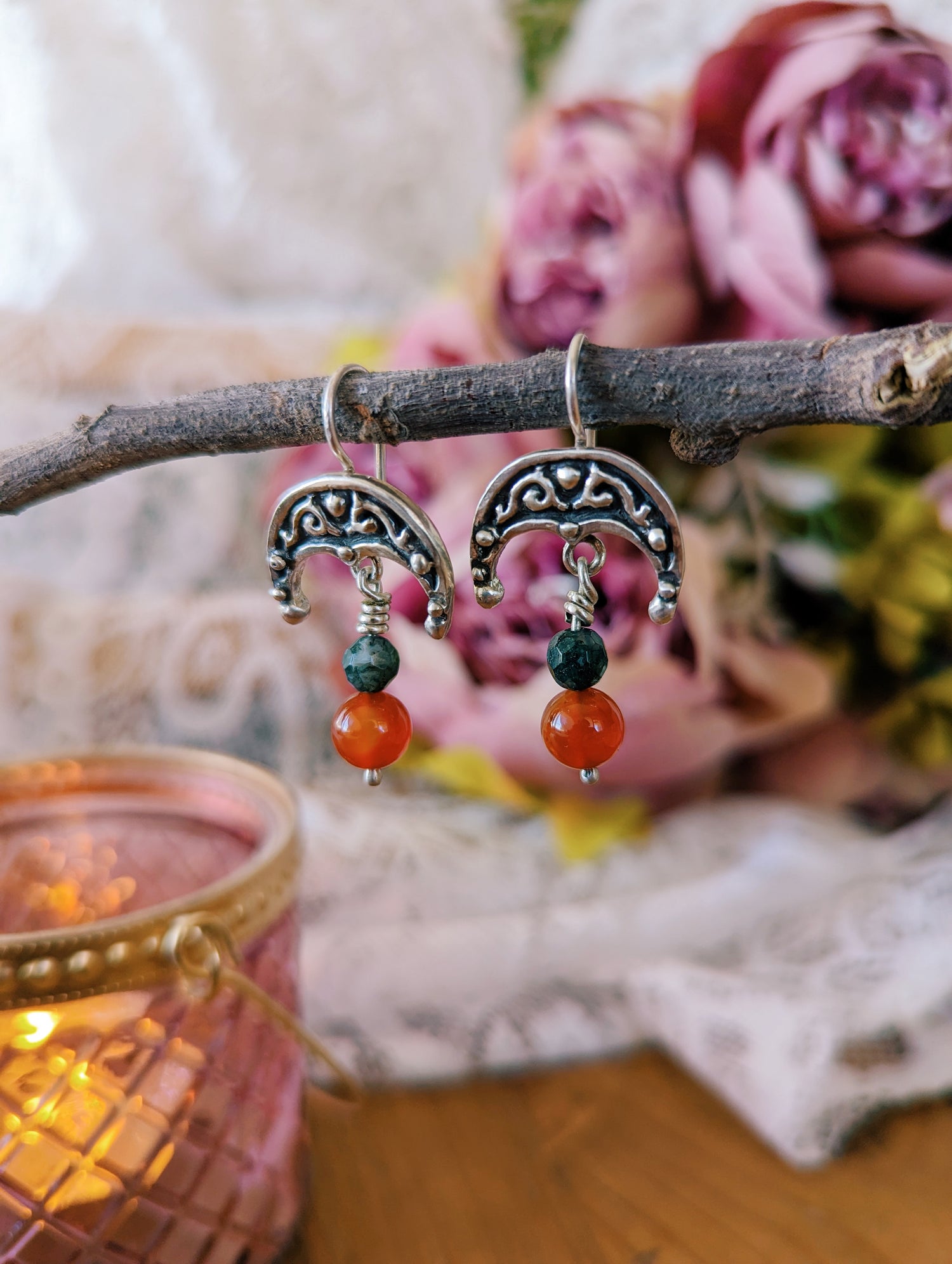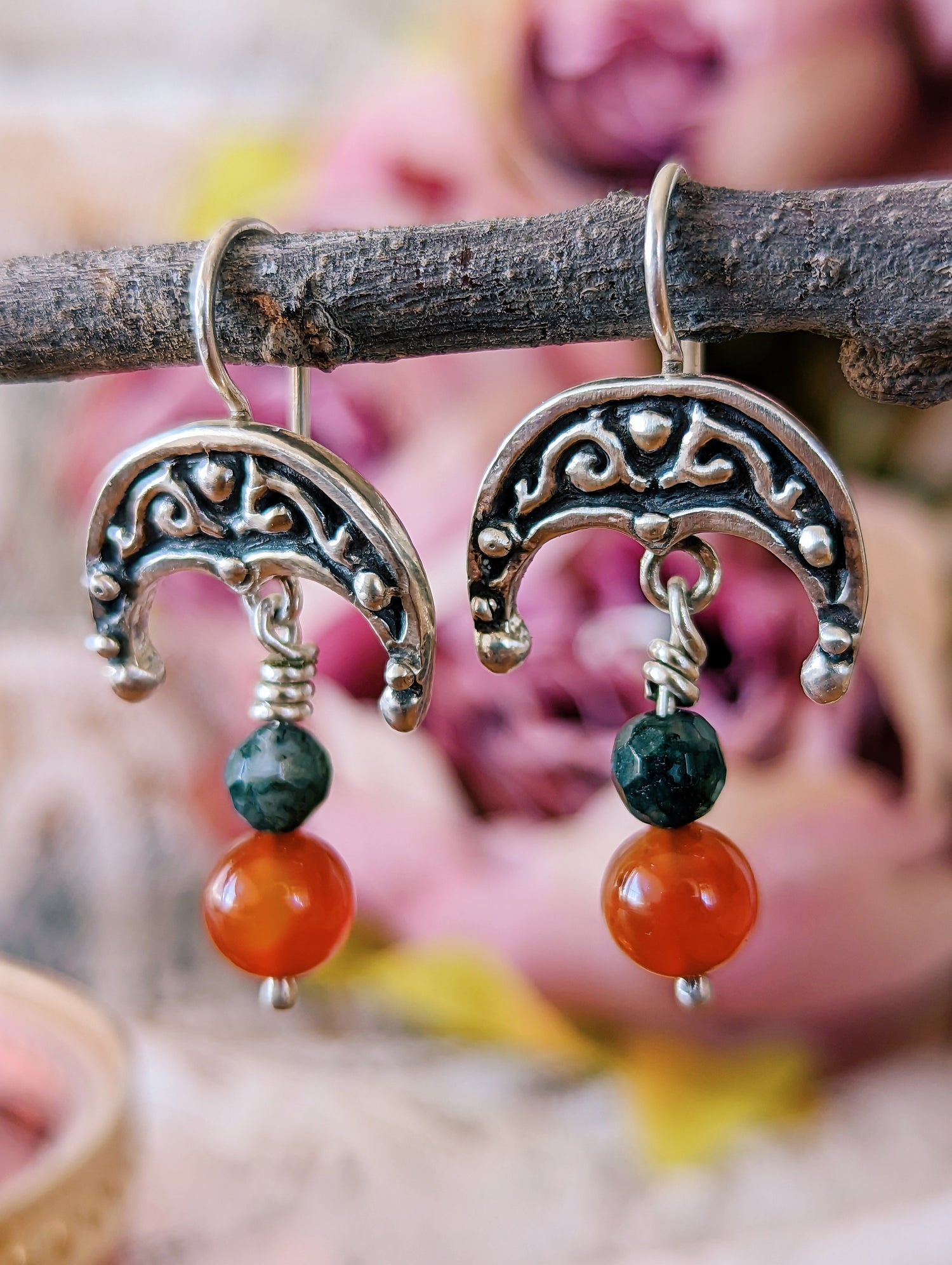 LUNULA EARRINGS with MOSS AGATHE and CARNELIAN beads - 925 STERLING SILVER UNIQUE HANDMADE