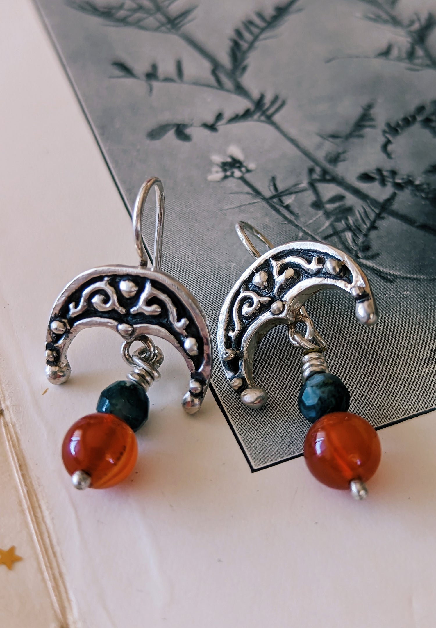 ★ 925 Sterling silver Moon / Lunula earrings with cute gemstones beads: moss agathe and carnelian.