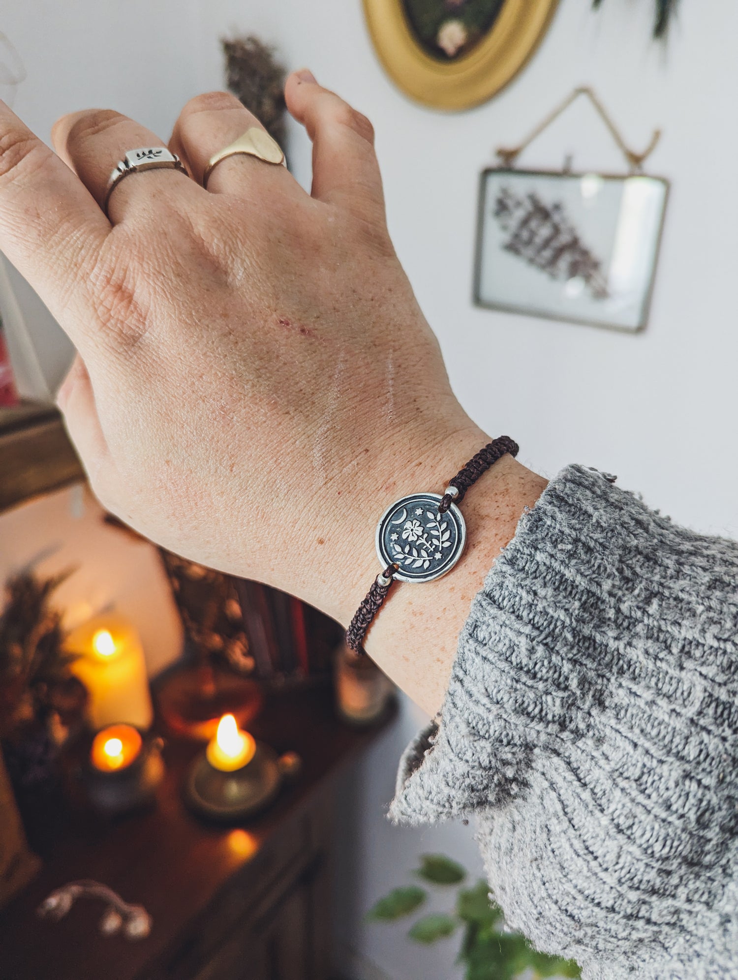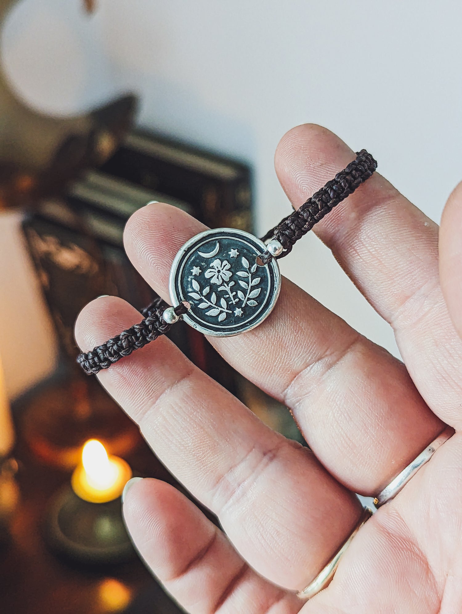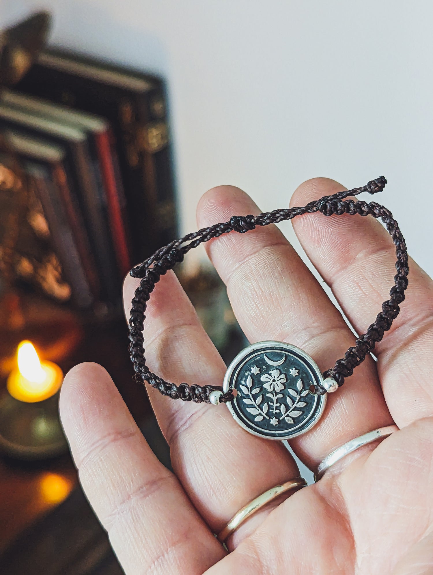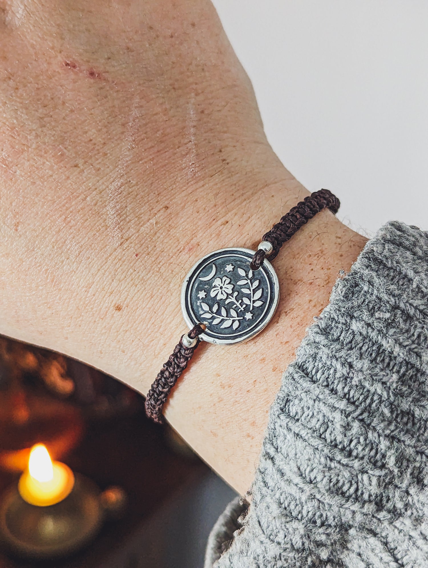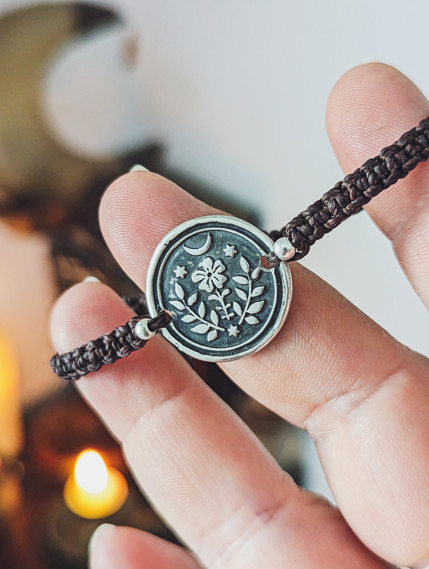 FOLK WITCH BRACELET - "GROW WILD" MOON FLOWERS MACRAME 925 STERLING SILVER TALISMAN - ADJUSTABLE WRIST BAND
