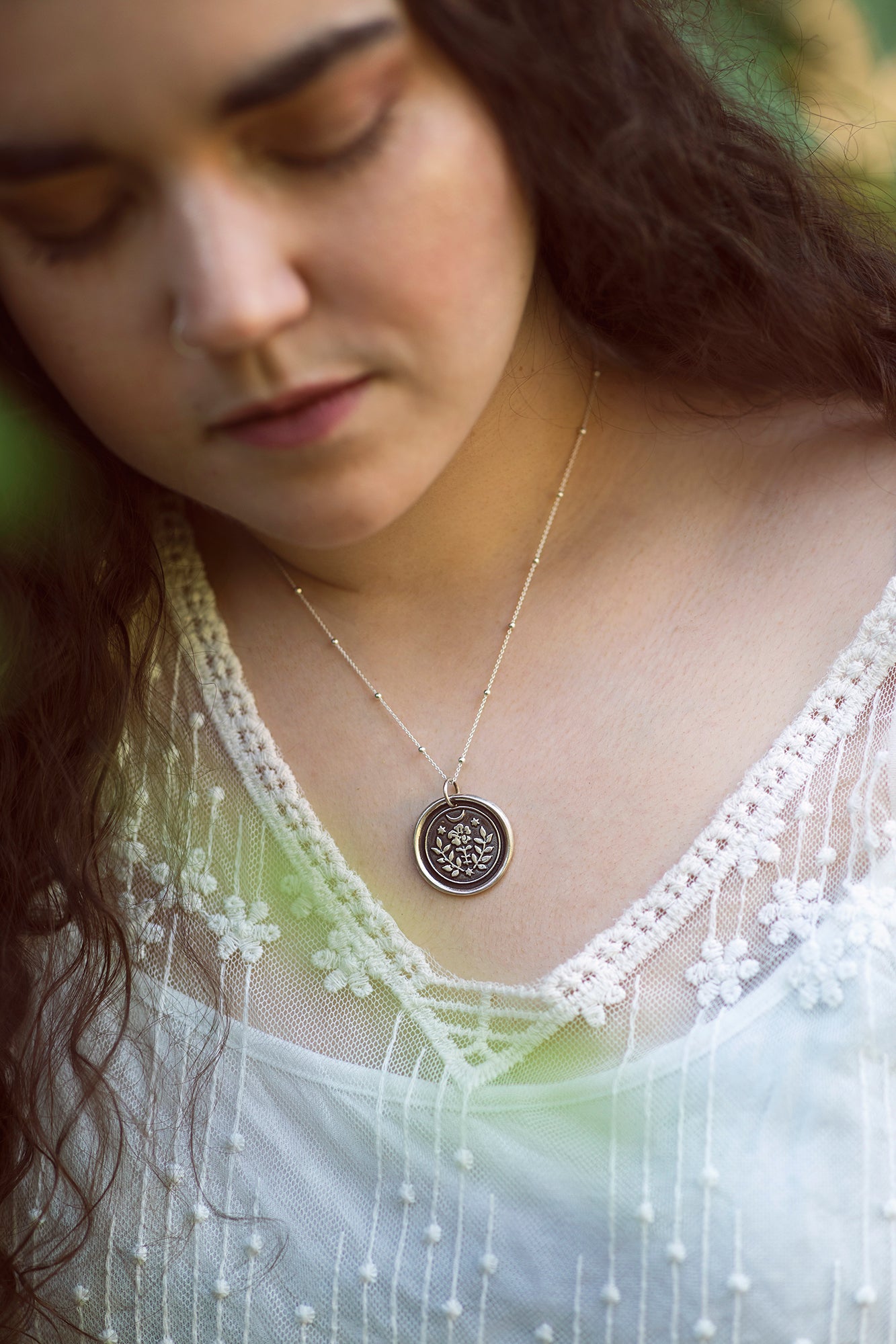 ★ Statement 925 Sterling silver coin necklace with vintage silver oxidized patina. This unique design "Night Flower" is inspired in nature, folk tales and the Triple Goddess. It reflects the motto "AS ABOVE, SO BELOW" Its like a spell claiming our inner magic and our ancestral link to nature. Original design from a wax seal stamp designed by Medusa Dollmaker. Pendant size: 2'8cm approx. Weight: 12g approx. Sturdy and ageless pendant, ideal for family heirlooms!