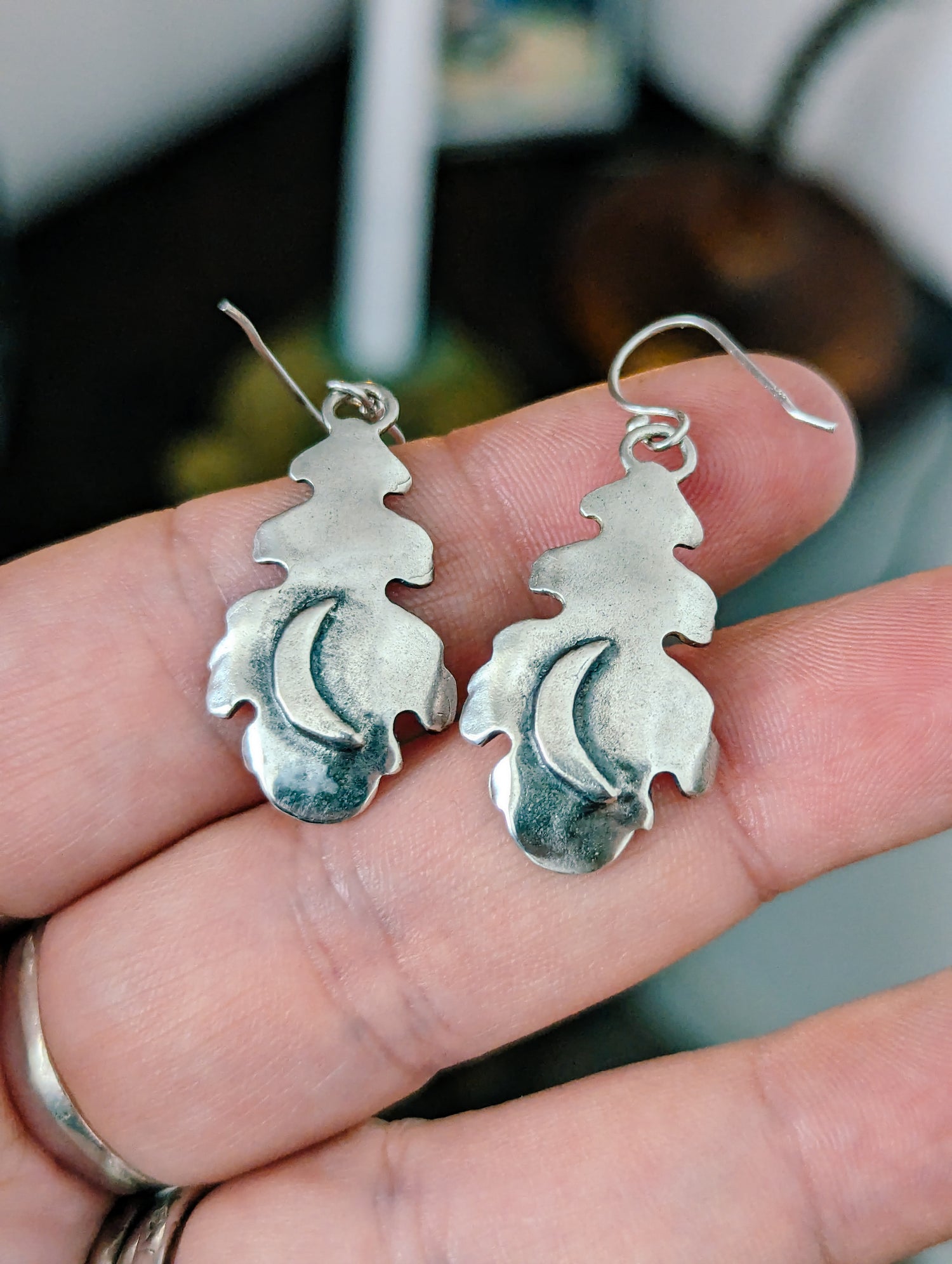 ★ OAK LEAF EARRINGS - 925 Sterling silver drop earrings with vintage silver oxidized patina and rustic finish. They have a moon in the back